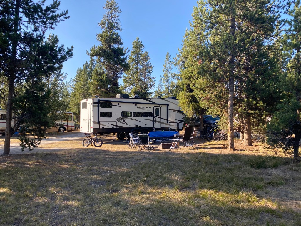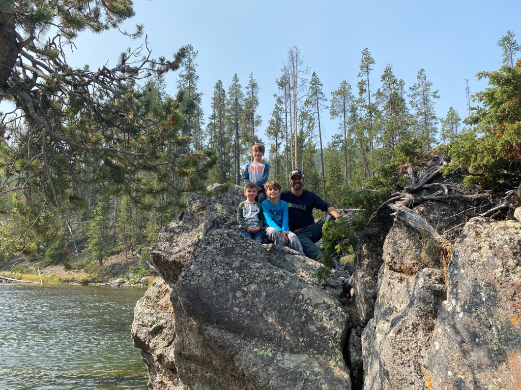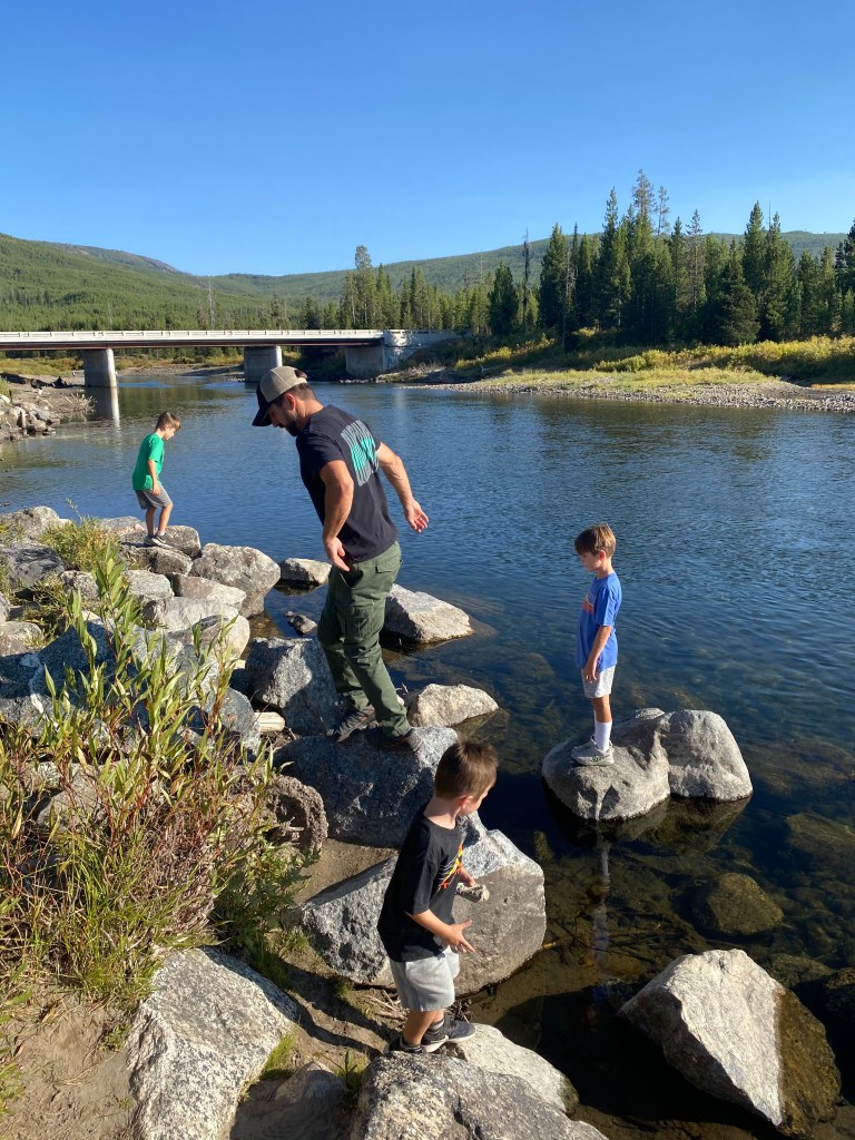 We arrived to our campsite at Headwaters Campground at Flagg Ranch. Amazing grounds and location! It is nestled at the north end of the Grand Teton National Park and also just 2 miles south of Yellowstone’s South entrance. The campground was in the middle of beautiful trees with the snake river just a few minutes walking distance. Brandon and the boys are excited to try and get some trout out of the river. Per our usual protocol, we hopped on our bikes and explored the grounds. We were in site #619 which had it’s own grassy area. The boys felt like they had their own yard and immediately began to build their own house out of sticks when we arrived.