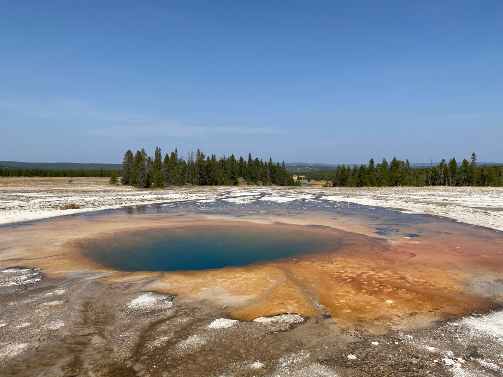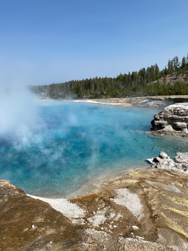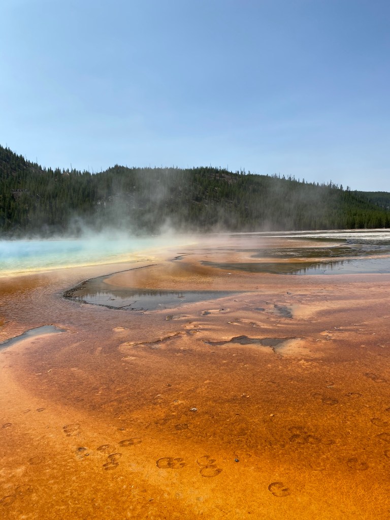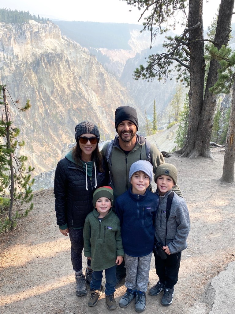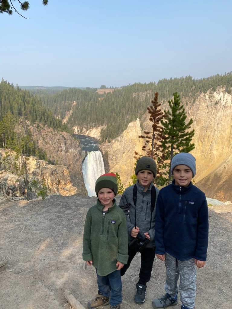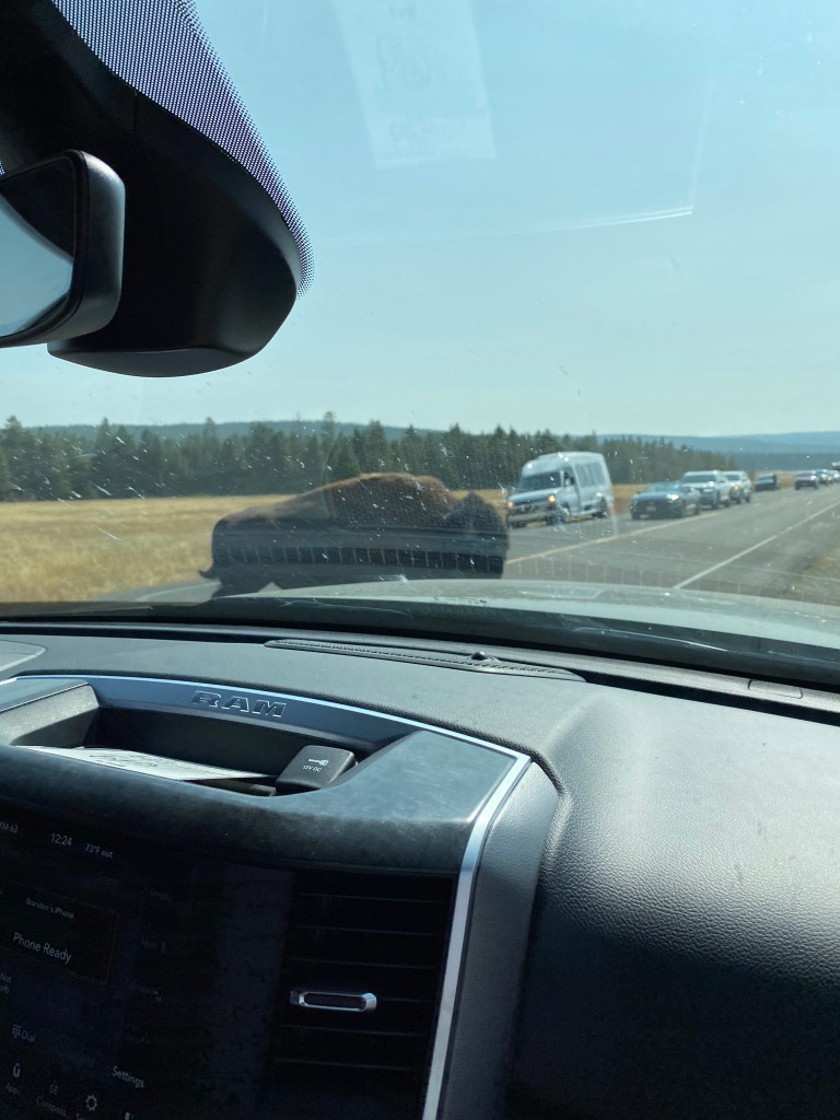 Monday the 14th we got up early and headed for Yellowstone! We were in the car by 7:00am and it was 30 degrees out. Our water hose froze overnight so no flowing water! Brandon has made it part of his experience to talk to other RVers along the way. He’s learned a ton. This trip, he got the tip to get a heated hose to avoid water freezing in the lines moving forward. So off we went to Yellowstone. Our plan was to do the recommended “loop” from the South Entrance. Within 10 minutes of being in the park, we saw some large Elk off the side of the road. As we made our way to Hayden Valley, Maverick spotted a Bison 50 yards from the highway so we got out to take a look. We made our way to the “Grand Canyon of Yellowstone” and got out for a hike. It was beautiful! We saw both the upper and lower falls and the canyon was amazing. Also on this hike the boys created a new game, “Bison”. They pretend they are Bison crawling through fields. Gotta love it. We left the Canyon area and went over to see the geysers and “Old Faithful”. Apparently Old Faithful “erupts” every 40 minutes or so. We arrived and within 5 minutes, we saw Old Faithful erupt! The man next to us said “nice timing”. In addition to Old Faithful, the other geyser basins and springs in Yellowstone are amazing. The colors are breathtaking and it was interesting to learn about them as we went along. After 8 long hours, we were ready to head back to camp. About 15 minutes after leaving Old Faithful, there were tons of cars pulled over on the side of the road. Off in the distance, you could see 3 Bison making their way towards the highway. Brandon positioned our truck at the front of a pullout which turned out to be the perfect viewing spot! All of a sudden the largest animal we’ve ever seen trotted across the highway right in front of our truck! This thing was huge! To note, there are several places to pull over throughout Yellowstone and the rivers/lakes are beautiful.