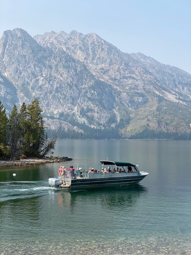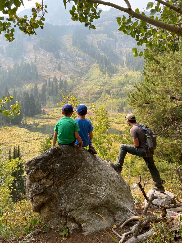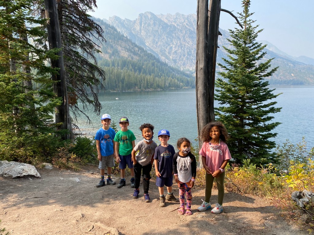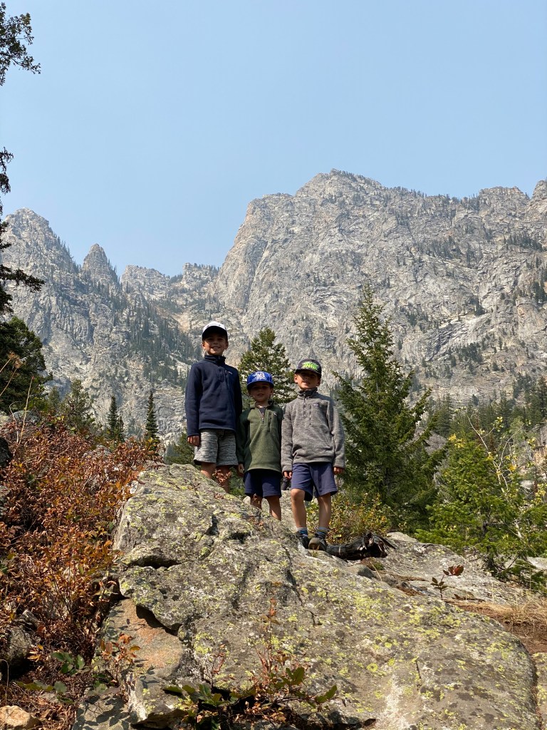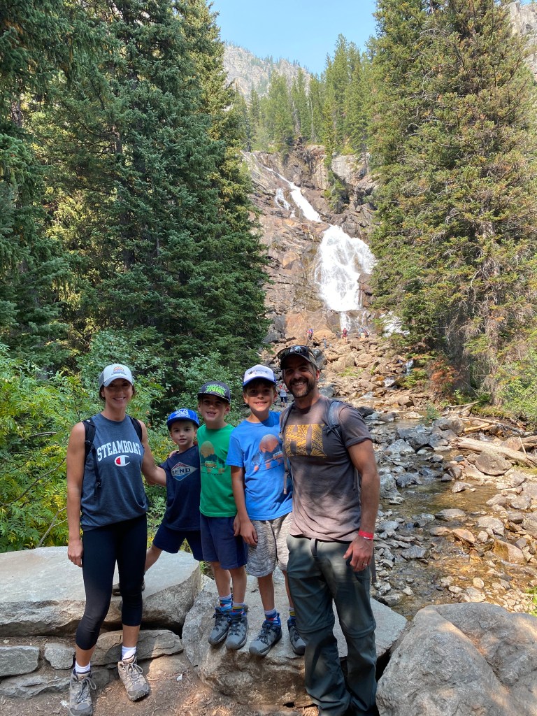 Wednesday the 16th was a day we were really looking forward to. It just so happened that the Register family, some friends from home, were going to be in the Tetons at the same time! We spent the morning doing some school and then headed for Jenny Lake. We took a ferry ride across Jenny Lake to do a hike at Hidden Falls. It was beautiful! The crystal clear water with the Tetons in the background was breathtaking. Definitely something we would recommend for anyone. The boys had a blast climbing rocks and running the trail to the Falls. As parents, our hearts stop as we watch them aggressively challenge themselves and take on rocks, rivers, trails and waterfalls. It is a joy to see them “be boys” and fortunately, no busted bones yet! We took the ferry back and met up with the Registers. So refreshing! They also have 3 kids and they had a blast together. We ventured off to hike Moose Pond. Our hope was to see some Moose! Sure enough, towards the end of the day, we saw a huge Mama moose and her “baby” splashing around in the pond. It was spectacular! It was nice walking the trail with our friends catching up on life and having some fellowship with each other. We finished our day skipping rocks together at Jenny Lake. It was so relaxing and peaceful. Time stood still and there was no rush to be anywhere. The boys jumped in the Registers van before leaving and explored how they were traveling. At the end of the day, we asked the boys “what their favorite part of the day was”. They responded: “Going in their van”.