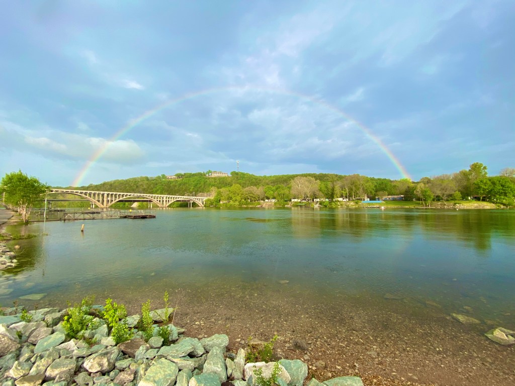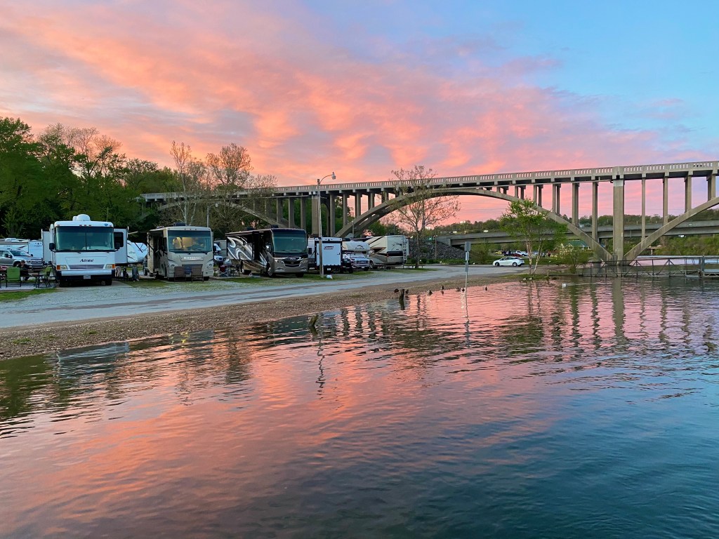 We left Nashville and knew we were going to have bad weather along the way. We did not realize HOW bad it was going to be. Made it to Kentucky (which was beautiful country) and into Missouri. Stopped for gas and the sky went dark and it started to sprinkle. Next thing we know, we are in a flash flood where I literally had my head to the windshield to see the highway lines in front of me. I could not pull over because I could not see, and, any traffic behind me very well would have plowed us down should we have stopped. For about 10 minutes, the truck went silent. Calm breathing with some prayer and we emerged out of the heavy rain! It was scary, particularly with the 5th wheel behind us. We had a bit of a break and then checked our tornado app to find 3 warnings within 40 minutes of us! We dodged all that and arrived at our campsite. Come to find out, the campsite tornado sirens had gone off 3 hours before we arrived and sent all campers to the local Bass Pro Shop for shelter! Crazy.