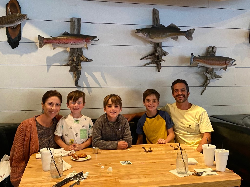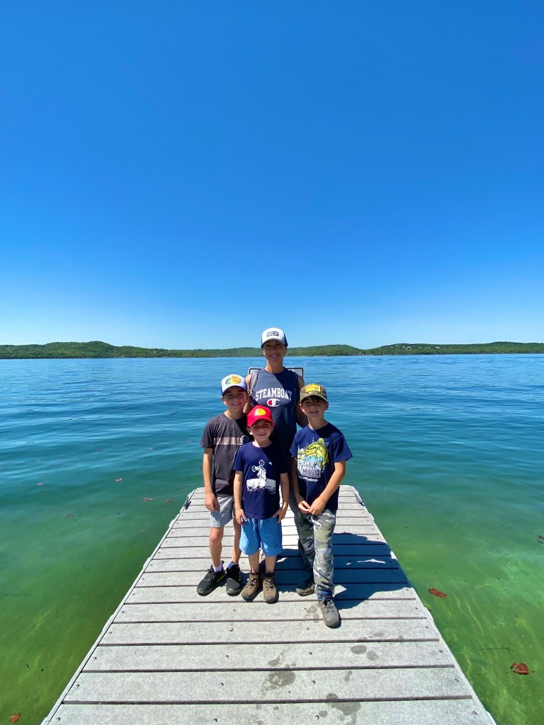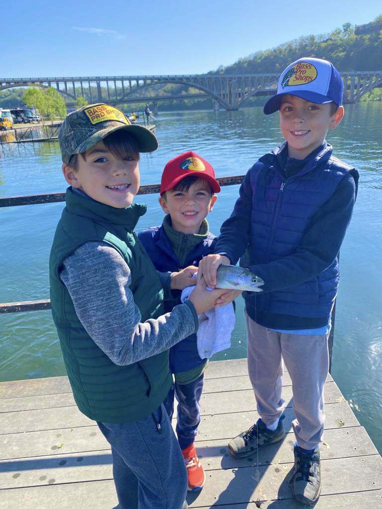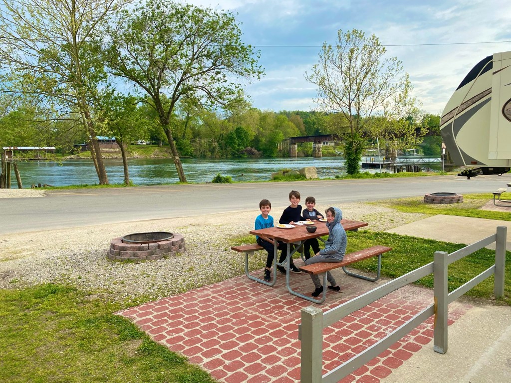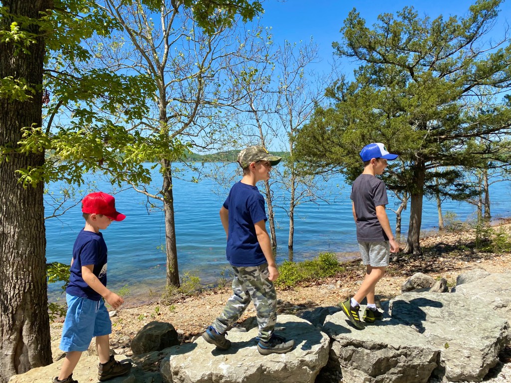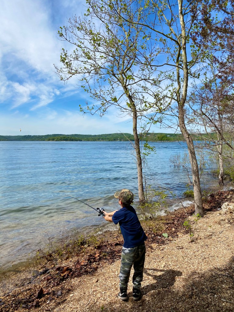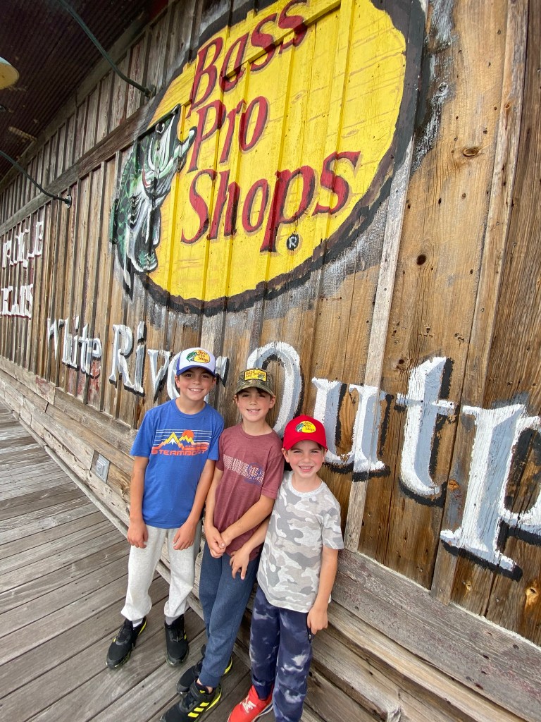 Speaking of Bass Pro Shop, the boys were absolutely thrilled to go to their “1st Bass Pro Shop”. It was great. They had so much fun going up and down the aisles checking out all the gear. Boats, knives, fishing gear…the works. They were in their element! We had a great dinner after shopping and settled into our spot on Lake Taneycomo. A client of mine recommended the RV park and it was great!